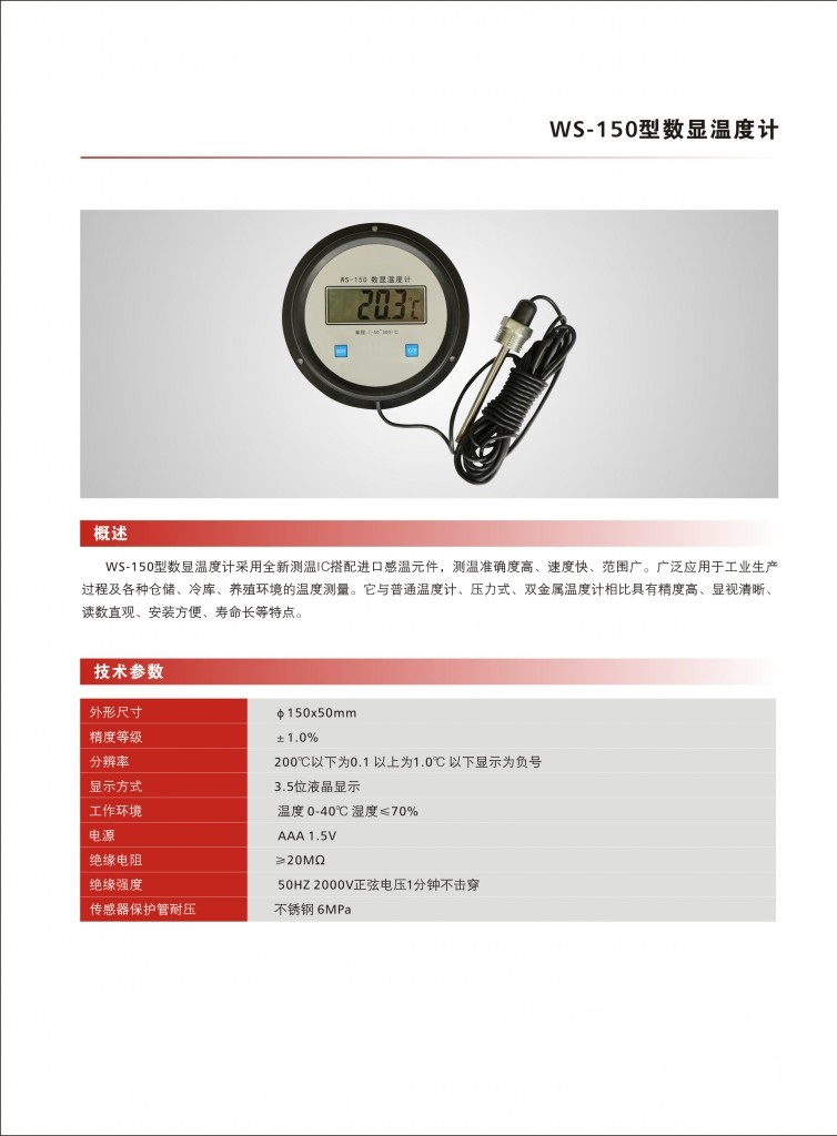 主題特點:WS-150型數(shù)顯溫度計采用全新測量IC,搭配進口感溫元件,測溫準確度高,速度快,范圍廣。廣泛應用于工業(yè)生產(chǎn)過程中,及各種倉儲,冷庫,養(yǎng)殖環(huán)境的溫度測量。